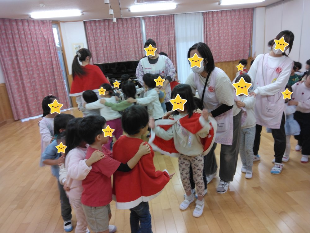 園長先生のお話のあと、まず初めにじゃんけん列車を行いました!勝ち進んでいくと先頭のお友達はサンタの帽子やケープをつけて盛り上がりました!