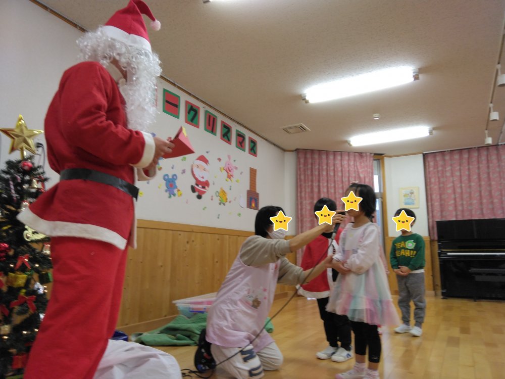 ついに待ちに待ったサンタさんの登場です!子どもたちは目が点になって驚いていましたがニコニコと嬉しそうでした!