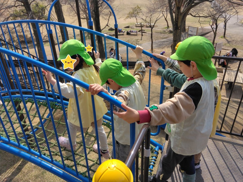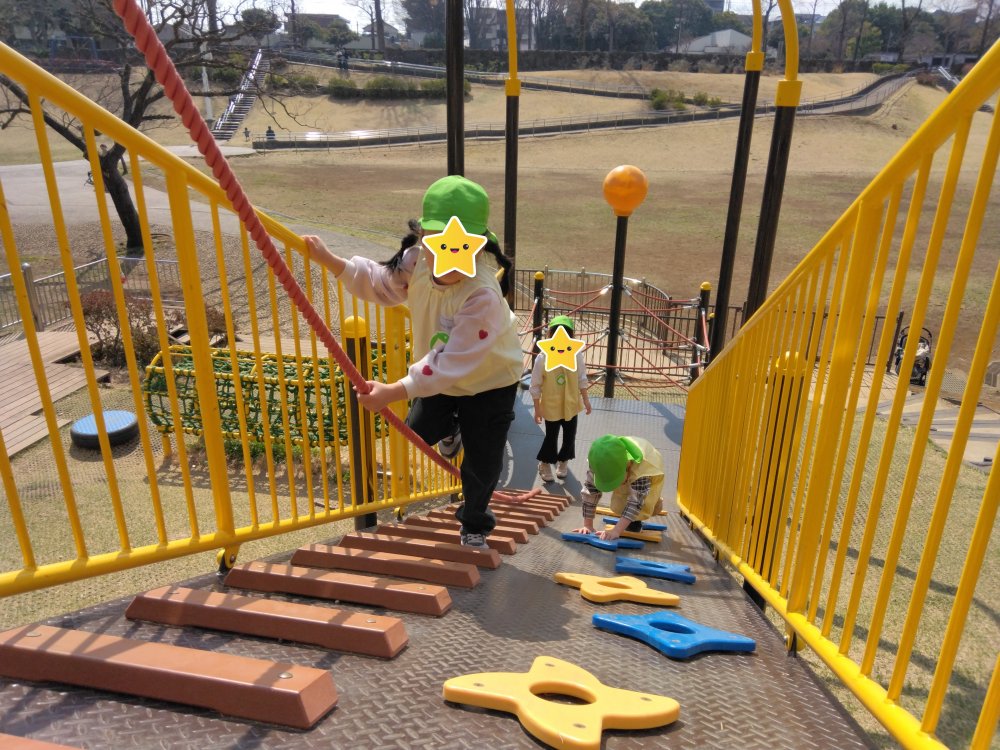 アスレチックでは、すべり台や長いロープを捕まりながら登ったり、高い場所にある網を慎重に渡ったり、先生と鬼ごっこをしたりと沢山遊びました。